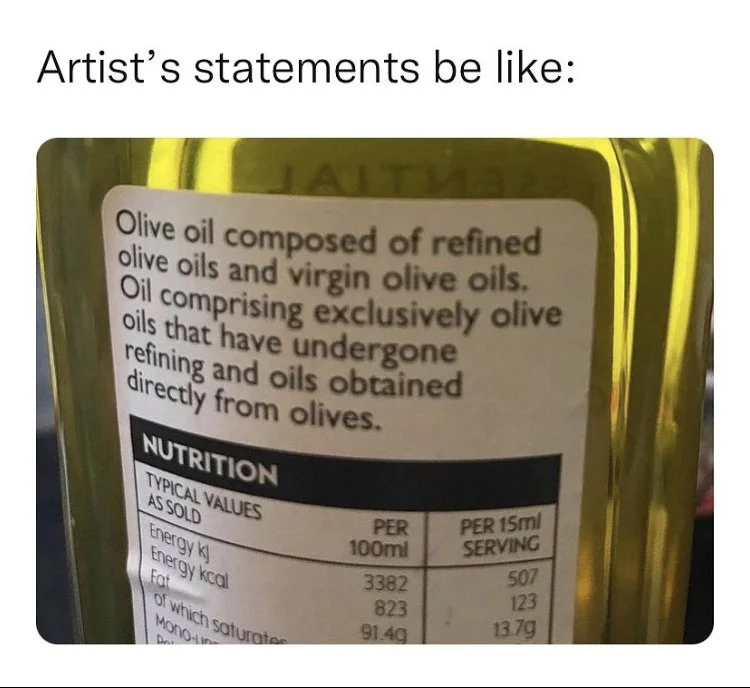 I have to be honest. I can’t with the pretentious artist statements. I know I should be professional and just speak about myself in the third person along with the best of them, but I can’t bring myself to! The meme below comes to mind. (Memes are one of the highest forms of art there is).